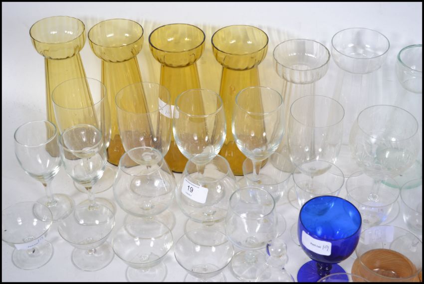 A collection of mixed glass ware to include a set of six toddy / hot punch glasses with wooden holders; various wine and spirit cocktail glasses; lead crystal glasses; a Bristol Blue glass goblet along with several hyacinth vases.