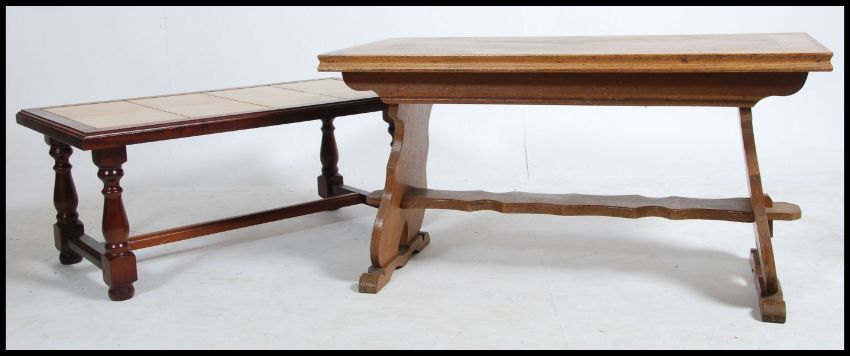 A 20th century oak coffee table in the Quaker style together with a mahogany effect tiled top coffee table. Measure 52cm high x 98cm wide x 49cm deep.