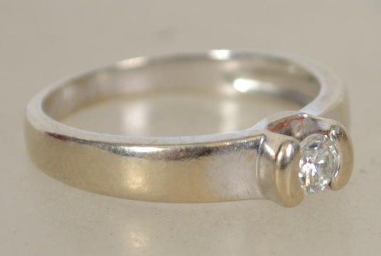 An 18ct white gold ladies single stone diamond ring approx 20pnts to the claw mounted diamond. Total weight 2.8g / Size K