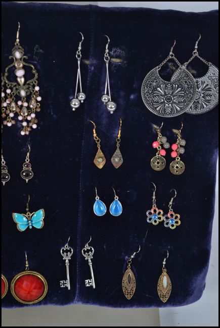 A group of 20 costume jewellery earring pairs to include, Art Deco style, filigree, an enamel butterfly pair, pictorial, crystal stone drops etc.