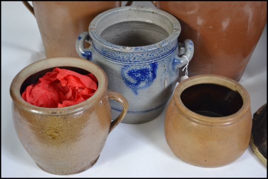 An interesting group of eight German ceramic pots/jugs/vases of various sizes three of which are double handled, some blue grey examples along with a brass coal scuttle with ceramic blue and white handles and an early victorian kitchenalia jelly mould. The tallest measures 31cm high.