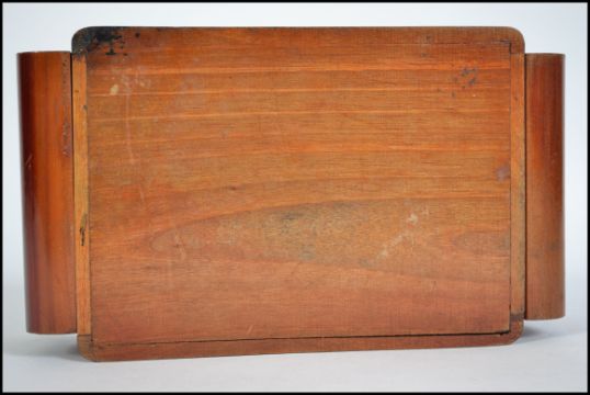 An early 20th century inlaid cigarette case of table top form with marquetry decoration and metamorphic cigarette holder set within. Complete with letter found in the base from 1940 regarding the war. Measures 22cm wide.