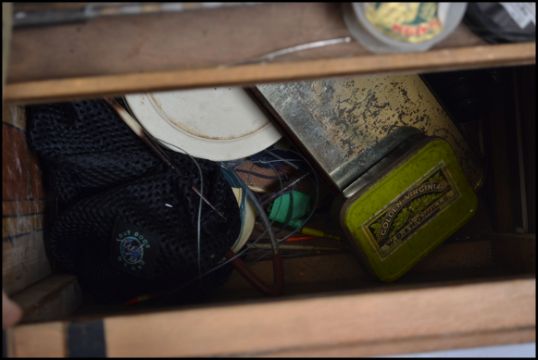 A vintage 20th century Fishing tackle box seat in ebonised wood with canvas strap. The interior complete with contents. Measures 45cm high.