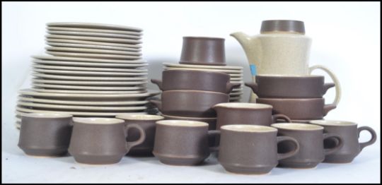 A Purbeck Pottery nine person Brown Diamond Purbeck service, to include dinner plates, side plates, coffee pot, cups, sugar bowl, creamer, bowls, saucers etc please see images