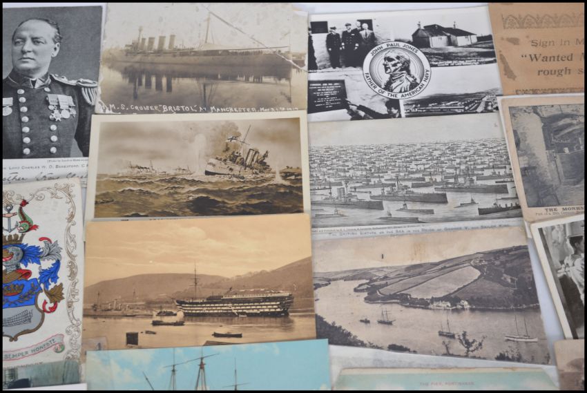 A collection of postcards mainly military & Naval interest to include The British Empire on the Sea, Admiral Beresford, Vindictive, HMS Nelson.Kings Dragoons Guards, Dartmouth, Swansea Docks, HMS Eagle, Sir Thomas Hill, HIndhead, Sailors Tombstone, The Deed, Training at HMS Impregnable, The Monks Retreat Fleece Hotel Gloucester, Ships Pet Biilly of HMS Barham, HMS Hussar at Portishead, Sinking of Hms Majestic, HMS Agamennon, HMS Victory, The Brittania at Dartmouth, HMS Sydney sinking German cruiser Emden, Devonport Hereldic, Georgian Warship, MS Cruiser ' Bristol ' at Manchester 1912, The Pier Portishead, Southpool Creek Salcombe, Lt Gen Sir John Moore