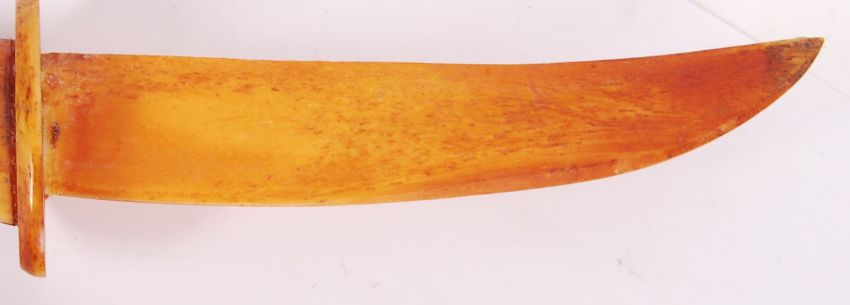 A 20th century Chinese oriental bone carved knife. The bone scabbard carved with tradition and erotic oriental scenes. Measures approx 24cm long.