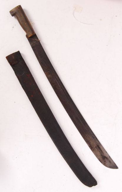 A rare pre-WWI German made military machete. Made by Luckhaus & Gunther (crest to blade and impressed marks to sheath). Used in North Africa. Within the original matching leather scabbard. Measures approx 71cm long.