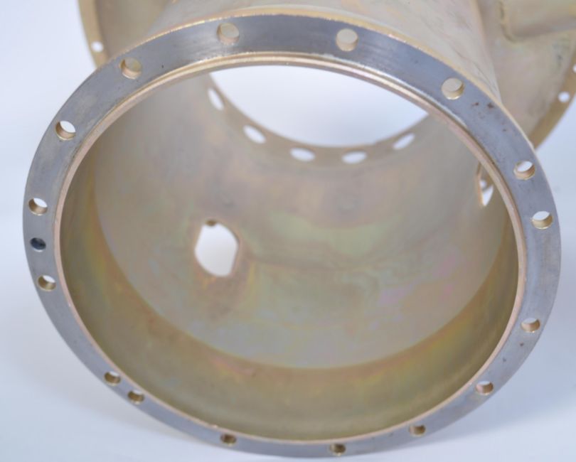 A pair of Industrial brushed steel helicopter engineering parts, each of conical form with gilded appearance, ideal as planters or base for coffee table upcycle project. Measures 32cm high x 37cm across.