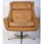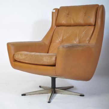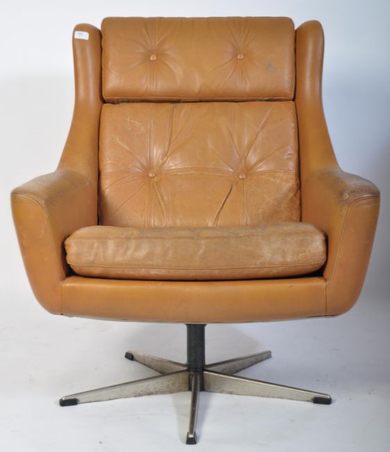 A retro 1960's mustard yellow leather swivel armchair of angular form being raised on a chrome 5 star plinth base. Measures 92cm high x 80cm wide x 91cm deep.