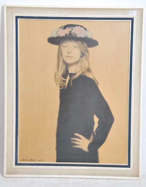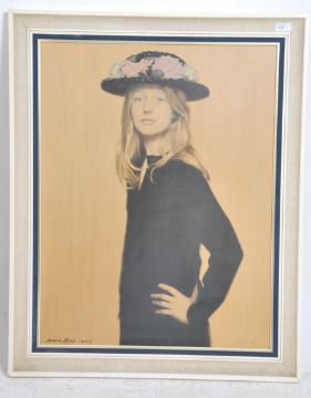A mid century 1965 framed and glazed print  entitled ' Her Mothers Hat being Signed to corner by the artist with notation to verso. Measures 76cm high x 58cm wide.