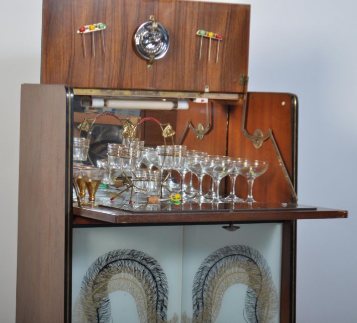A mid century retro cocktail cabinet having coloured art glass sliding doors with articulated top having mirror lined interior complete with Babycham glasses and contents etc. Measures 106cm high x 61cm wide x 34cm deep.