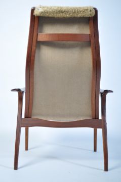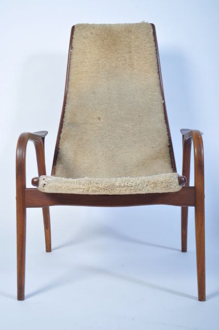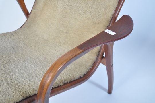 A 20th century Yngve Ekstrom beech framed lamino easy chair - armchair with believed fabric upholstery. The bentwood frame having stunning lines. ( one support to bentwood having some movement, not snapped but animal glue dried out and in need of resetting ). Measures 100cm high x 70cm wide x 80cm deep.