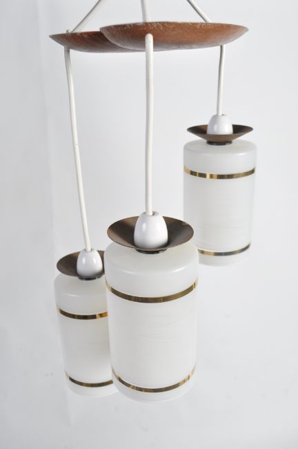 A set of three triple drop ceiling lights.  These vintage lamps have opaque glass shades hanging at various heights with gold banded trim and teak effect metalised fittings and ceiling roses.  Said by vendor to be tested and working. Measures 36cm long each.