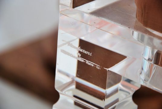 A large Philippe Starck manner table and chairs. The dining chairs of resin construction having overstuffed seats and back rests all the manner of Starck for Kartell. Together with a large marble and resin pedestal glass dining table. The table raised on marble and clear resin plinths with bevelled glass large lozenge shaped top above. The table measures 75cm high x 240cm wide x 112cm deep.