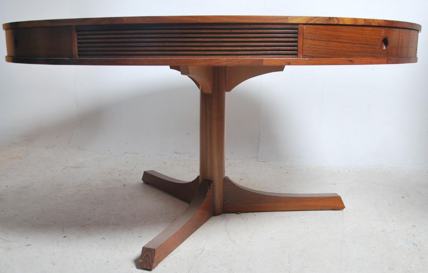 A mid century retro Robert Heritage for Archie Shine large drum shaped dining table. The round top with three frieze drawers interspersed with horizontal reeding and being raised on a tripod base