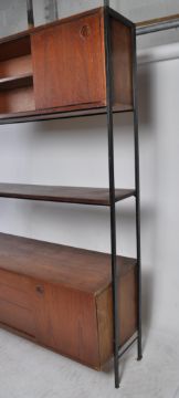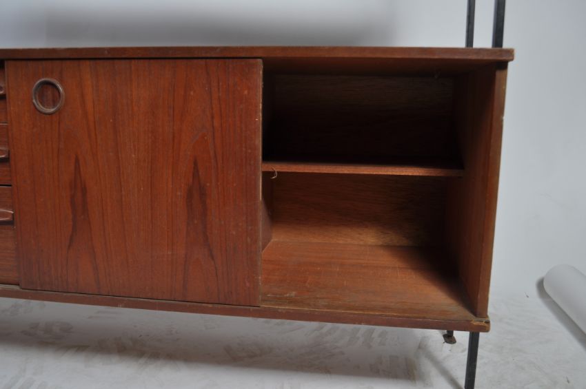 A retro 20th century teak wood and metal modular wall system - sideboard cabinet by Avalon. The black metal uprights supports a series of cabinets / shelves etc. Measures 180cm high x 170cm wide x 45cm deep.