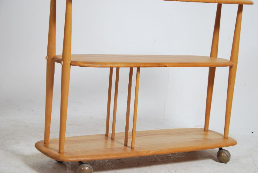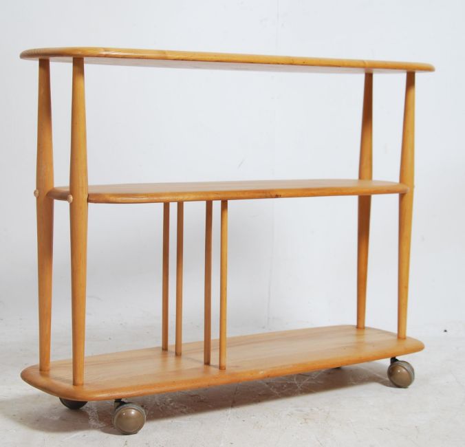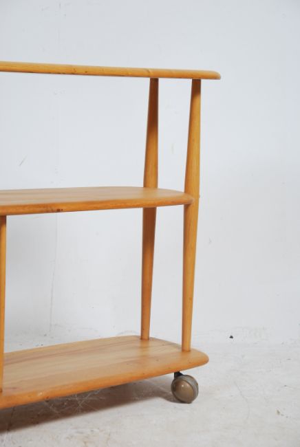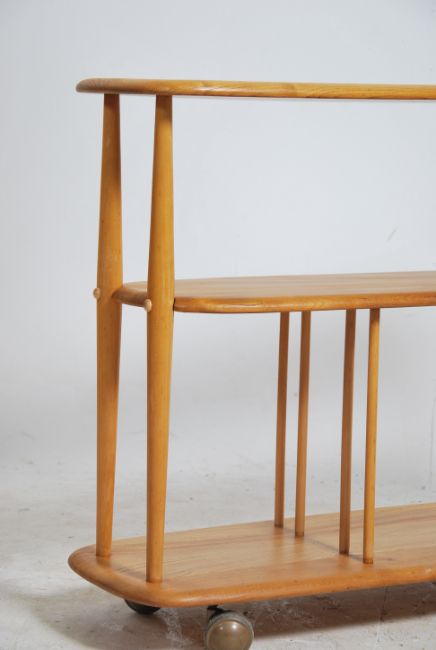 An Ercol beech and elm wood 20th century low room divider having chamfered edge lozenge shaped tiers raised on spindle supports with original castors to underside. Measures 70cm high x 91cm wide x 32cm deep.