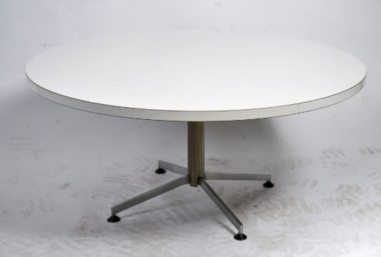 A 1960's white laminate circular coffee table in the manner of Arkana raised on a chrome support. Stamped to the base Nosag Southend. Measures 49cm high x 107cm across.