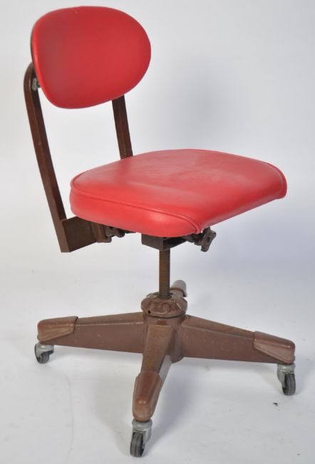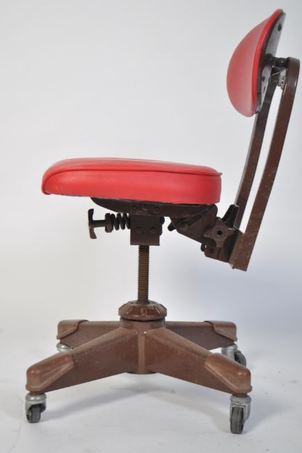 A vintage 20th century industrial swivel machinist chair. Raised on four painted  metal tubular feet, adjustable height, red vinyl seat pad and back rest. Applied makers badge to the verso for Form Flite. Measures 80cm high x 36cm wide x 40cm deep.