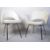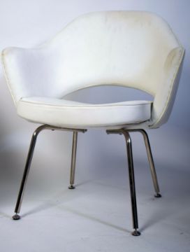 After Eero Saarinen, a near pair of white  faux leather and chrome upholstered ' executive ' side chairs. Raised on tapering chrome legs frames with tub shaped upholstered chairs having pierced back splats. Originally designed and retailed for Knoll furniture. A matching pair of black executive chairs in lot 143. Measures 82cm high x 71cm wide x 60cm deep.