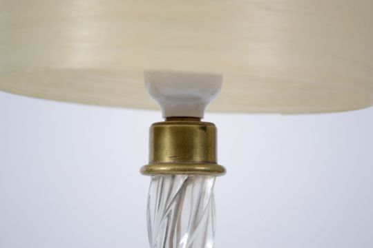 A vintage 20th century retro Murano clear studio art glass lamp base of twist form having a floss woven fibre glass shade. Measures 62cm high.