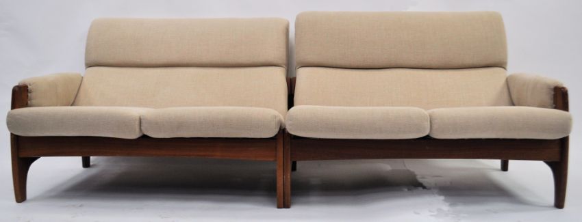 A 1960's mid century Danish teak modular ' twin ' sofa settee. Believed to be originally from Heals of London, the teak wood frames having raised angular show wood frames being recently upholstered to a high standard with beige French linen. The twin units uniting or separate to allow for coffee / occasional table etc.