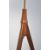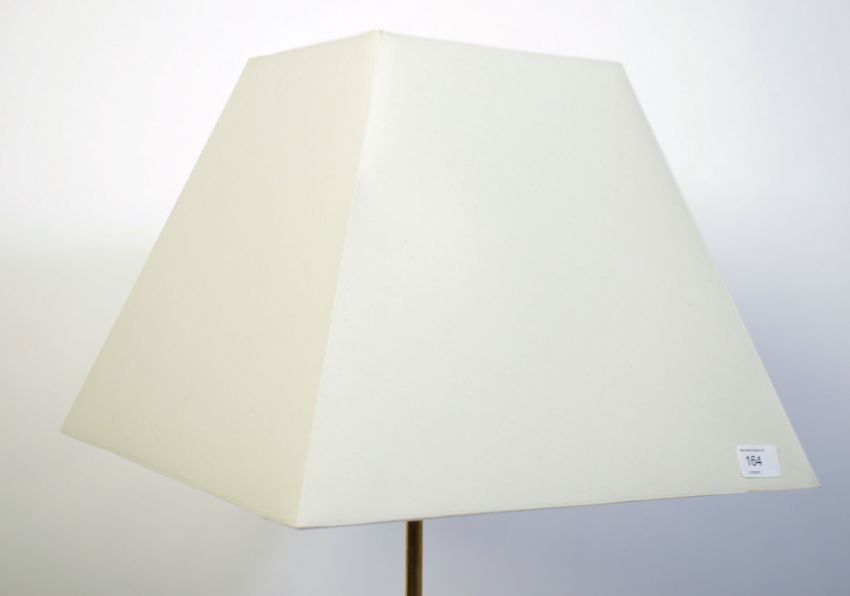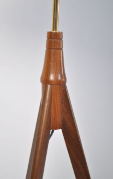 A retro 20th century teak wood Danish inspired standard floor lamp of tripod atomic form with beige shade atop. Measures 135cm high.