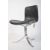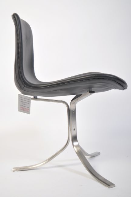 After Poul Volther. A stunning black leather and polished steel open armchair. The splayed polished steel base with stunning black leather upholstered shaped chair above.  Measures 79cm high x 52cm wide x 58cm deep.
