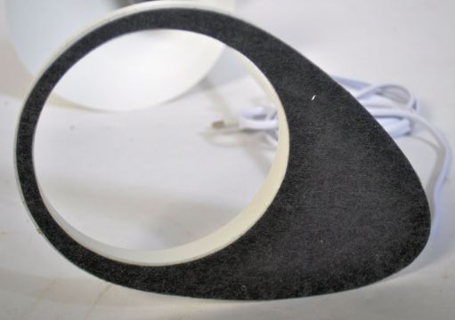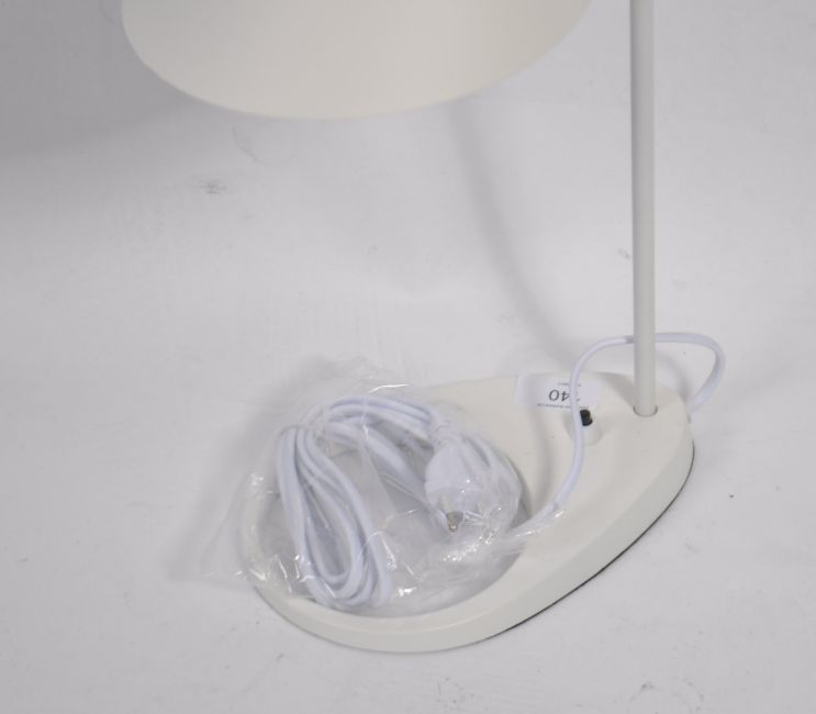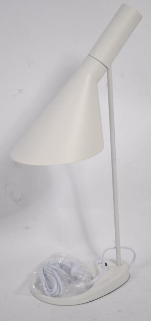 After Arne Jacobsen for Louis Poulsen 1960's, A retro white AJ desk lamp. Comprising of a tilting movement within a shaped cone standing on a tear shape with a cut out circle. Measures 55cm high.