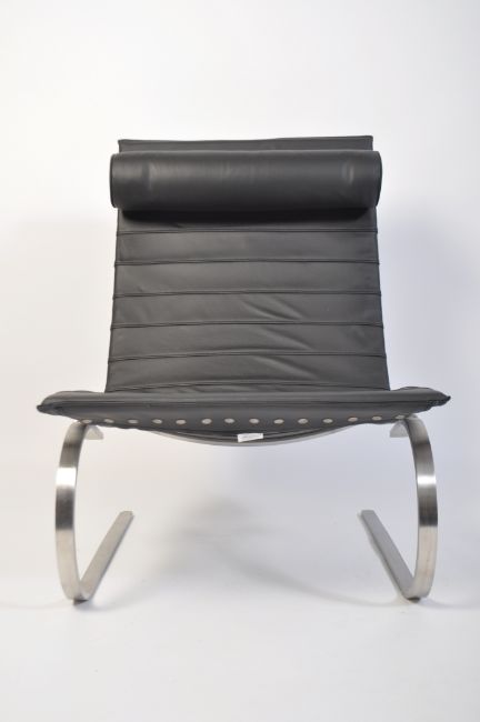 After Poul Kjaerholm, a stunning black leather and polished steel PK20 armchair / chair. Raised on stunning cantilever heavy polished steel frame with stitched black leather upholstery with belt back barrel head cushion. Matching 2nd in lot 200. Measures 91cm high x 56cm wide x 80cm deep.