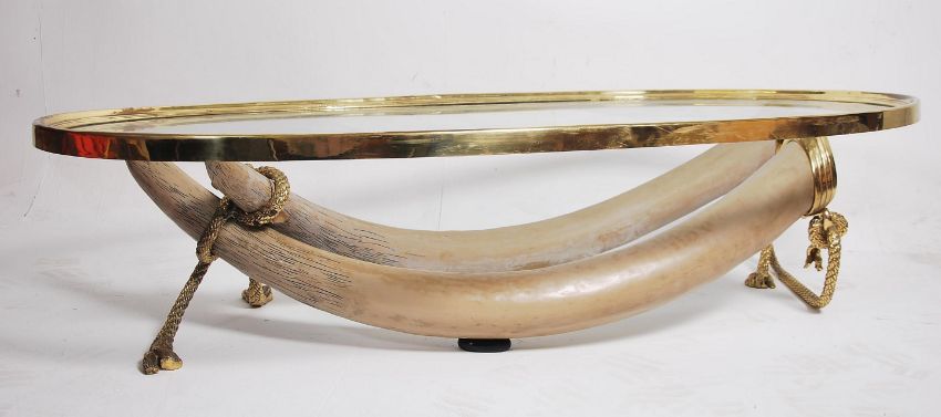 A 1970's coffee table  by ST Valenti of Madrid, Spain. This iconic large occasional coffee or centre table raised over full sized faux tusks with gilt rope embellishments supports a large and heavy glass table top with brass banded borders. Measures 42cm high x 170cm wide x 100cm deep.