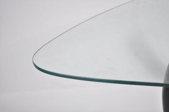 A good contemporary Isamu Noguchi coffee table - occasional table having glass top raised over a tripod shaped ebony resin case with chrome fittings base. Measures 42cm high x 121cm wide x 72cm deep.