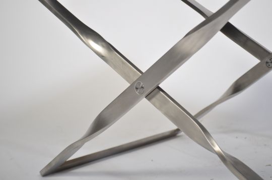 After Poul Kjaerholm. A stunning PK91 black leather and brushed steel folding foot stool / footstool. The heavy folding brushed steel base with good black leather top being stitched either end. Measures 30cm high x 50cm wide x 35cm deep.