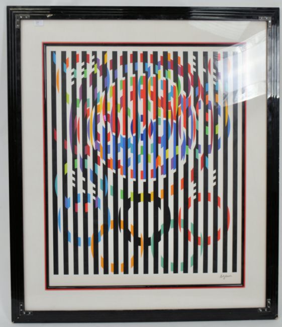 Yaacov Agam - A framed and glazed signed and numbered limited edition 28 / 300 contemporary silkscreen in multiple colours by Yaacov Agam titled " Message Of Peace " signed and numbered in pencil. Measures 120cm high x 96cm deep.