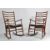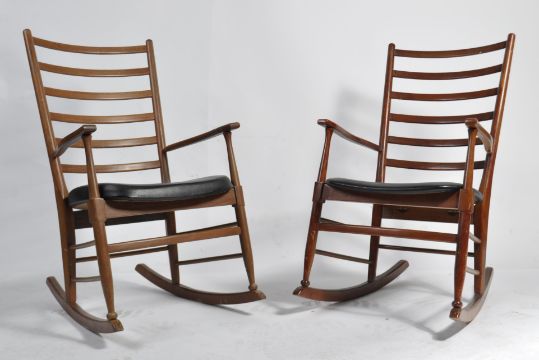 A rare pair of 1960's Danish teak wood rocking chairs being raised on turned supports with sleigh runners having black vinyl seat pads flanked by shaped elbow supports. Above and to the rear tall ladderback rests. Measures 92cm high x 52cm wide x 80cm deep.