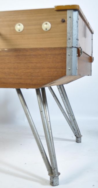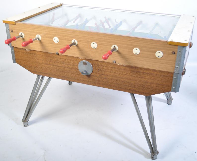 A 1970's retro  large table football foosball game. Raised on large cast metal hairpin legs with hinged top having players and handles to centre and sides. Measures 92cm high x 140cm wide x 76cm deep.