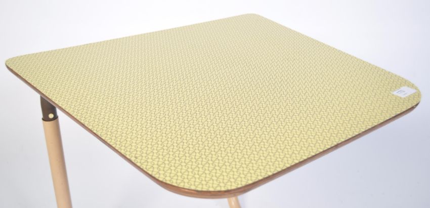 A vintage retro 20th century Staples coffee lounge chair table, having metal adjustable tubular legs under a stunning blue laminated top. Measures 35cm high x 54cm wide x 49cm deep.