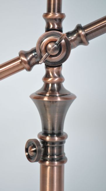 A fabulous polished copper anglepoise desk lamp raised on terraced base with tubular construction with adjustable long arm with half moon pendant shade. Measures 73cm high.