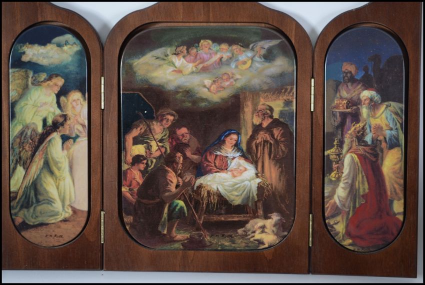A wooden tryptych opening to reveal ceramic religious panels depicting the birth of christ by BradEx. Together with a wall mounted wooden frame holding 3 religious tiles by Christopher Nick for Bradex of the last supper by Leonardo Da Vinci