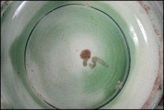 A collection of ceramics to include a Clarice cliff bowl, a majolica dish and a large footed fruit bowl - punch bowl. Measures:  27cms wide.