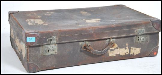 Early 20th Century large vintage leather suitcase .  This hand stitched luggage has several 'part' travel advertising labels attached. Measures 20cm high x 71cm wide x 44cm deep.