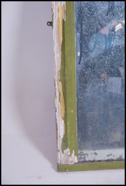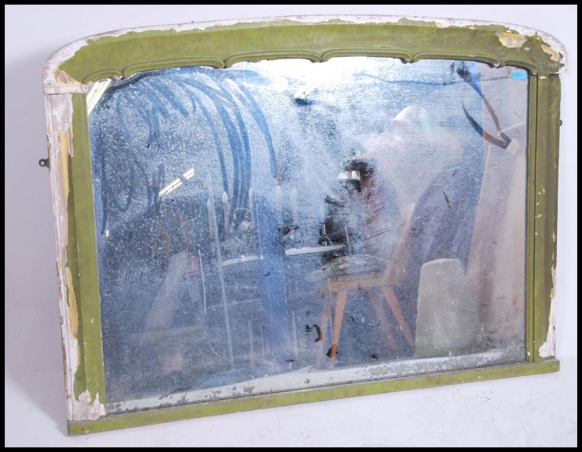 A Victorian large painted shabby chic overmantel mirror. Of rectangular form with shaped sides and finished in a later green paint with remains of gilt paint in place in parts. Back panel to the rear. Measures:  103cms high x 141cms wide.