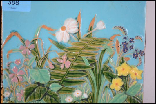 A 19th century moulded Minton majoilca tile with notation to verso for Minton Rollins & Co Patent Tile Works. Together with another aesthetic movement tile by Minton