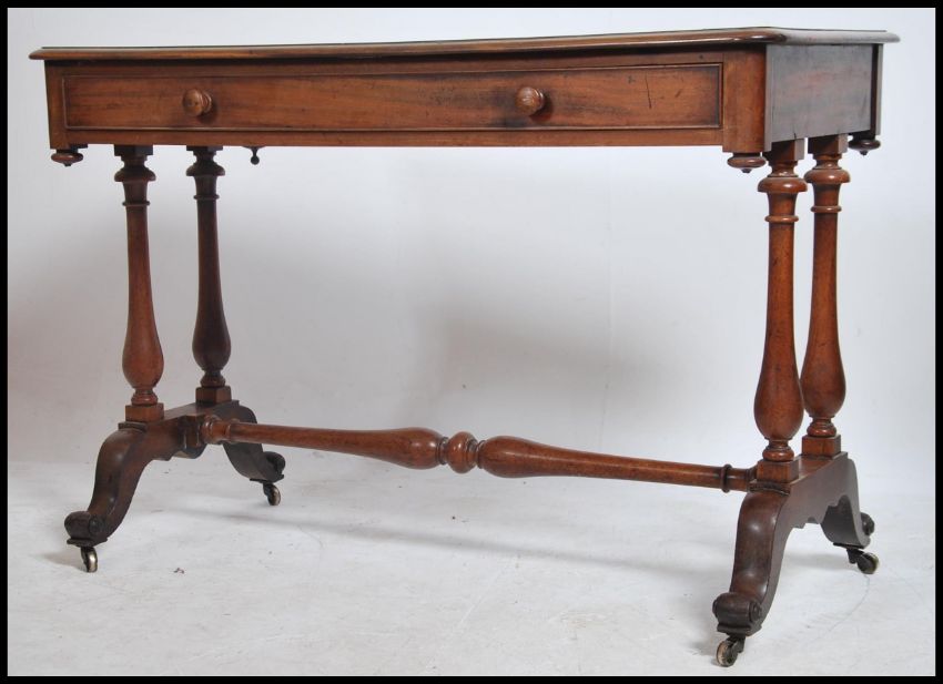 A good Victorian solid mahogany writing table desk. Raised on twin turned legs with splayed feet having a fitted frieze frame with inverted finials, Single drawer to centre under chamfered edge rectangular table top above. Measures:  73cms high x 106cms wide x 34cms deep.