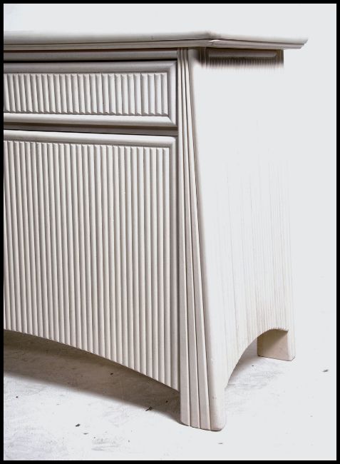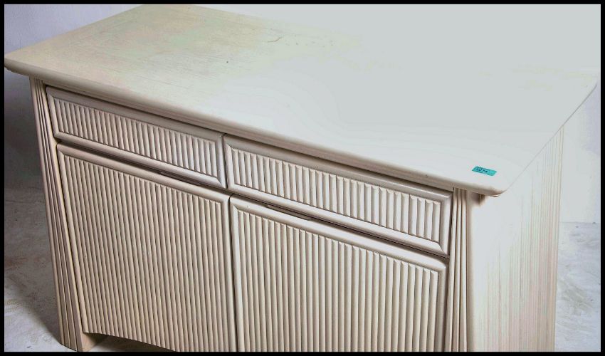 A retro 20th century Art Deco revival  designer painted sideboard having rattan weave facia cupboard doors with short drawers with flared top above. Shelved interior within. Measures:  63cms high x 120cms wide x 53cms deep.