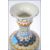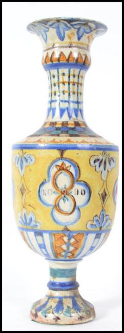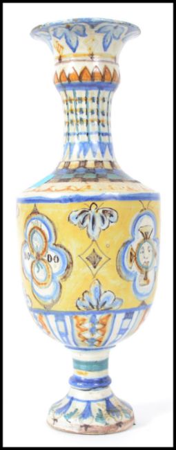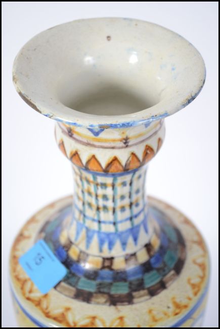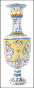 An unusual Faience continental glazed vase of tall form stylised with geometric patterns with moon faced masks within cartouches and notation No 10 to the others. Of baluster form with waisted neck. Measures 37cms high.