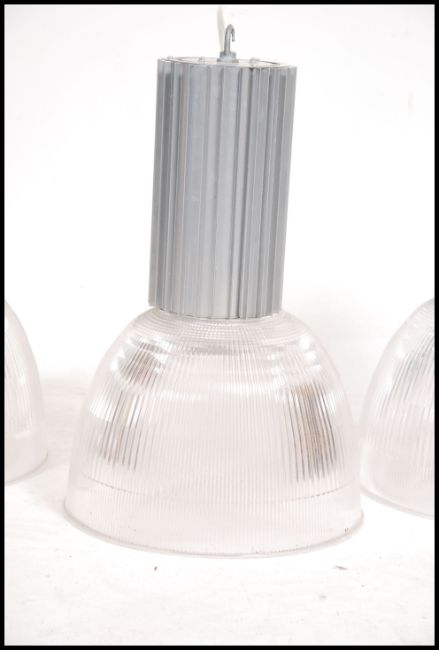 A set of 4 contemporary Industrial large factory pendant lights having half moon plastic shades with polished steel housings atop complete with the chains