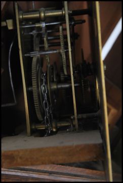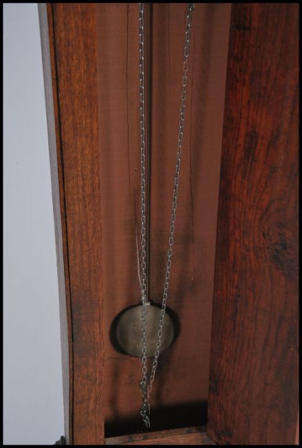 A Victorian painted face oak longcase / grandfather clock. The painted face with secondary aperture, faceted hands and roman numeral chapter ring. Complete with lead weight and pendulum.