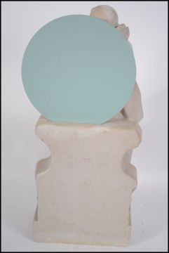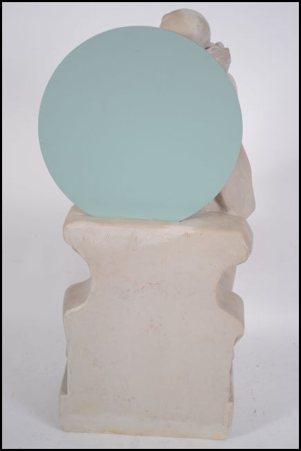 A large 20th century plaster figurine of a Pierrot / clown being raised on a socle plinth with circular mirror atop. Measures 57cms high.
