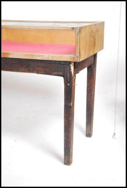 A vintage mid century retro shop haberdashery / museum display cabinet on stand. The light oak cabinet with glazed body bearing retailers label to the centre for JC KIng, Clerkenwell, London. Raised on a stripped pine tapered leg base.